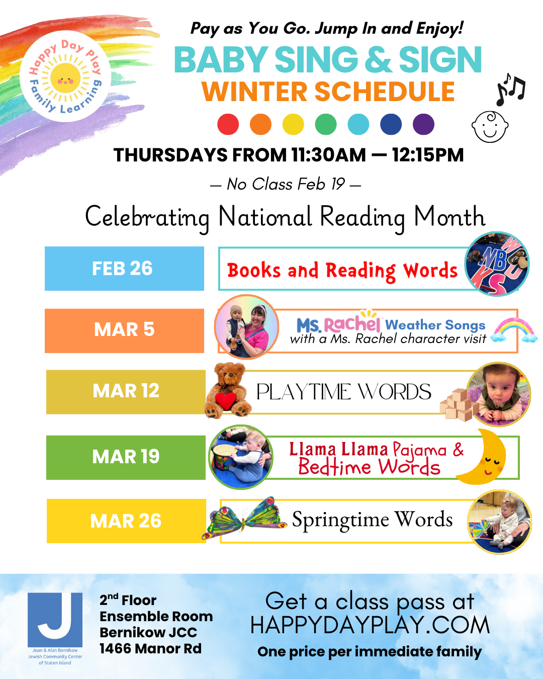 Thursdays from 11:30am to 12:15pm in the 2nd Floor Ensemble Room at Bernikow JCC 1466 Manor Rd Staten Island, NY 10314