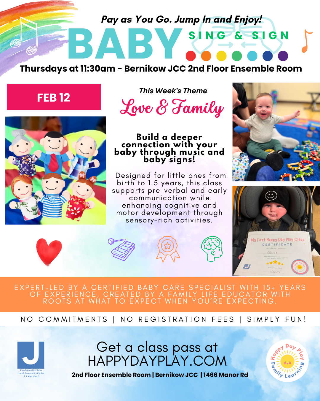 This special Valentine’s Day Baby Sing & Sign class features gentle songs, touch-based activities, and repeated signs create a rich sensory experience that supports bonding and early emotional language. Babies build communication skills while feeling safe, connected, and supported through music and movement.