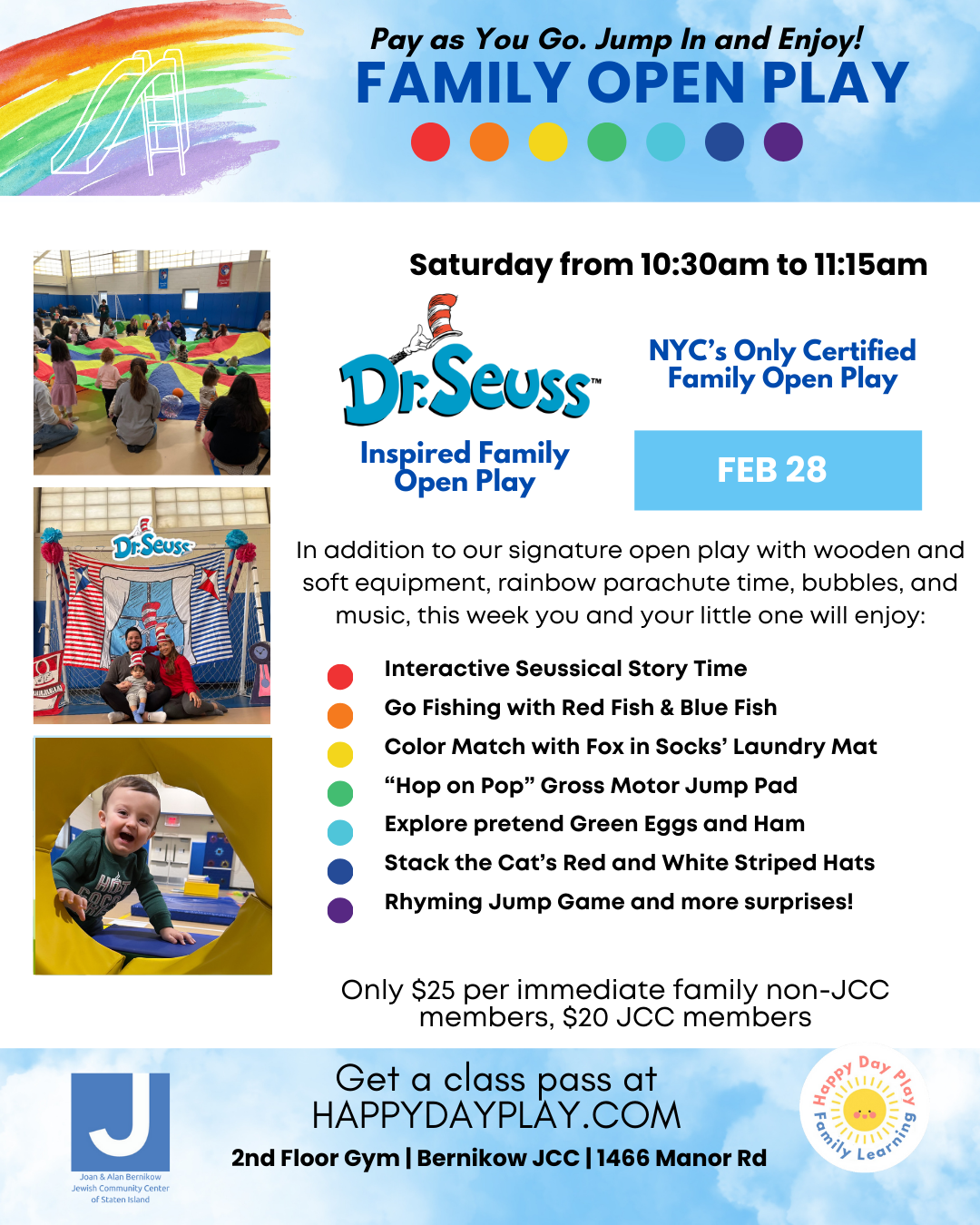 When you arrive, please go to the front desk and tell the JCC member that you have arrived for a Happy Day Play class. They will direct you to the room.