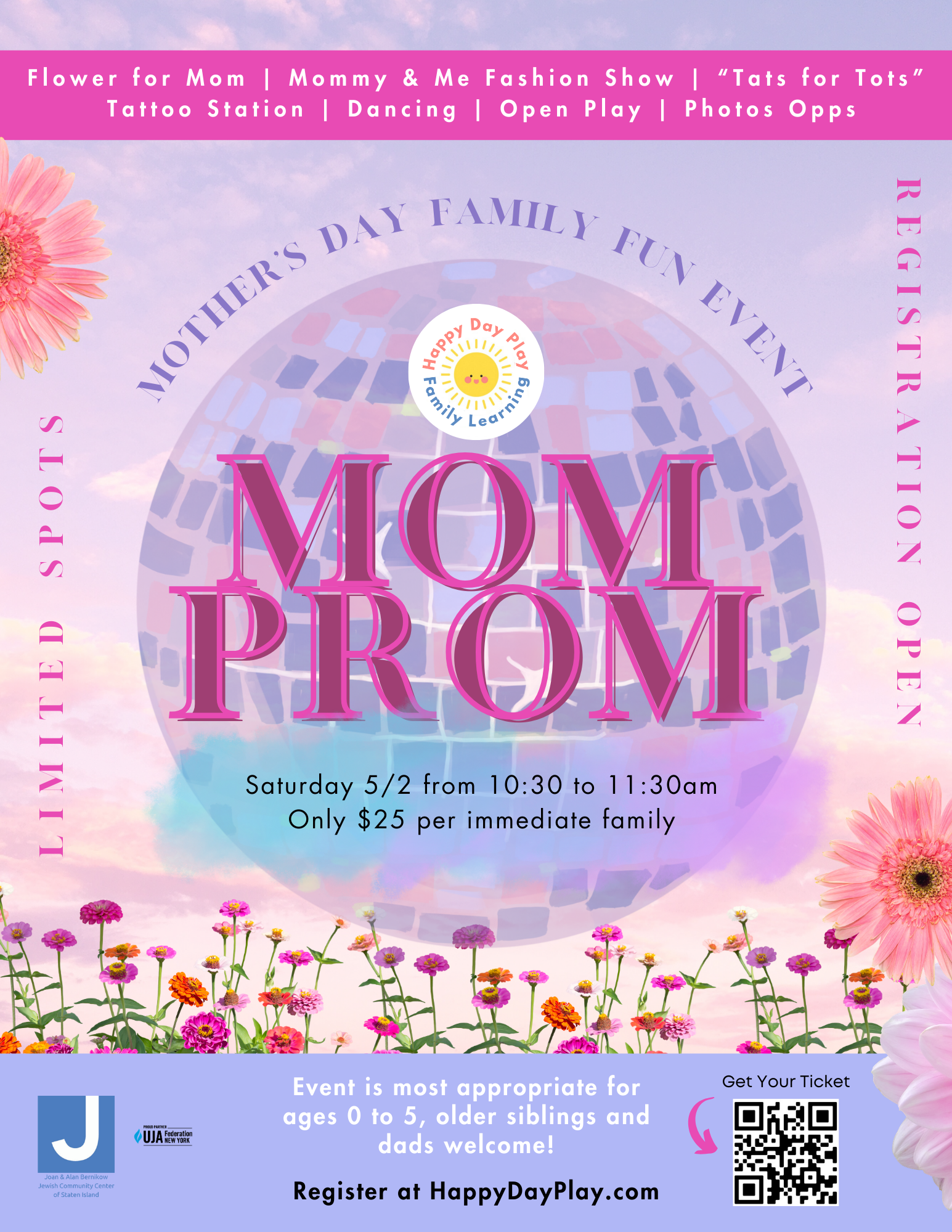 Along with our signature open play experience, you’ll enjoy a delightful mommy-and-me fashion show with prizes for Best Dressed and Best Pose, a flower for every mom, a “Tats for Tots” tattoo station, DIY tiaras, and plenty of surprises fit for royalty. It’s a day full of fun and love, dedicated to the reigning queen of your family!