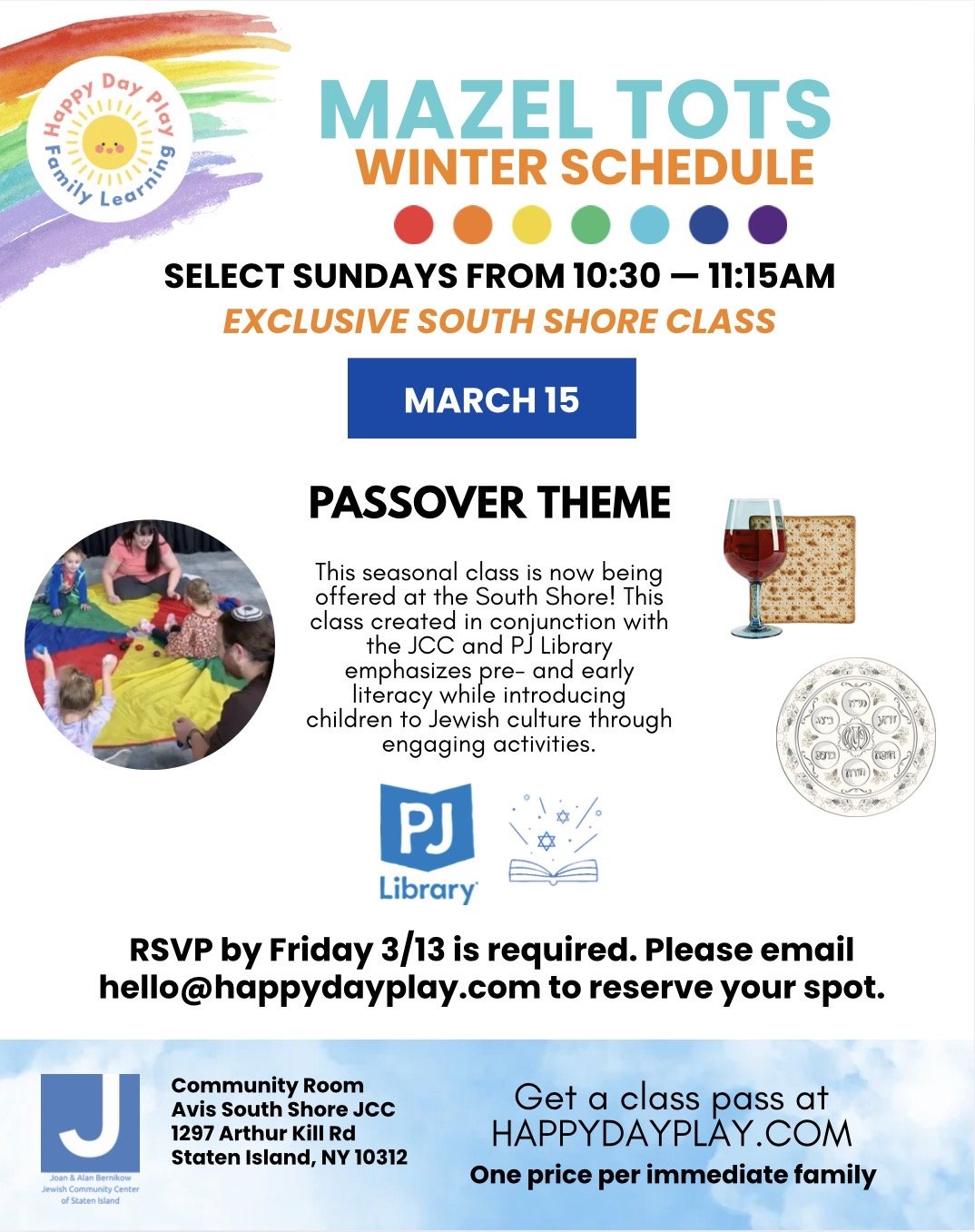 Celebrate Jewish culture and ignite early literacy skills in this unique, culturally enriched class for babies, toddlers and preschoolers. In partnership with PJ Library and the JCC of Staten Island, Mazel Tots is exclusively offered at Bernikow JCC. This class combines storytelling, songs, and engaging activities to introduce children to Jewish traditions while fostering a love of reading and learning.