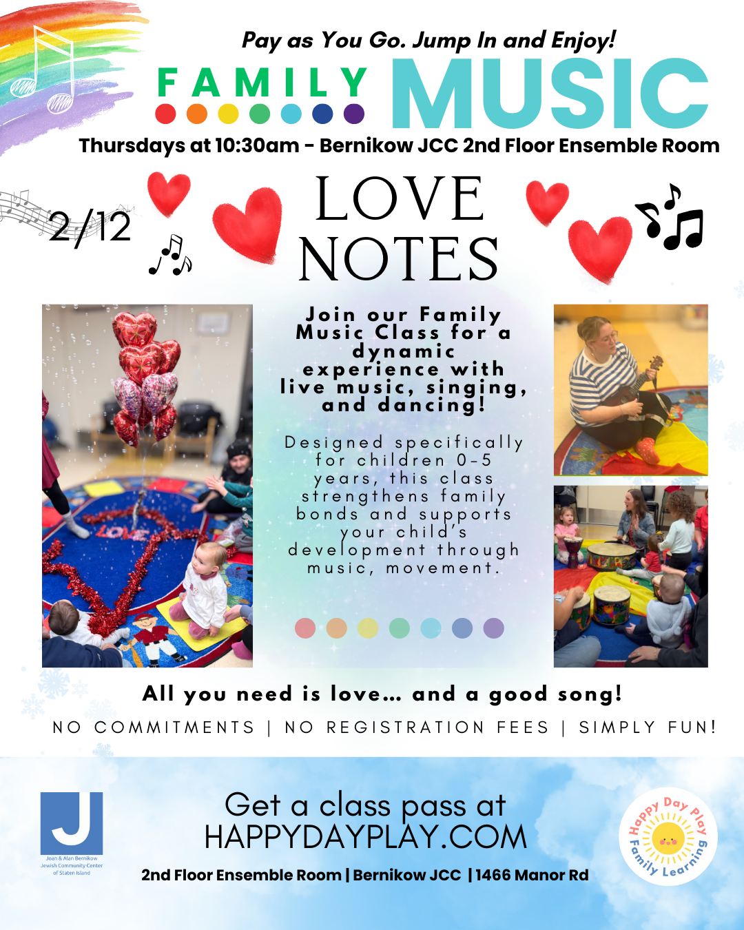 When you arrive, please go to the front desk and tell the JCC member that you have arrived for a Happy Day Play class. They will direct you to the room.