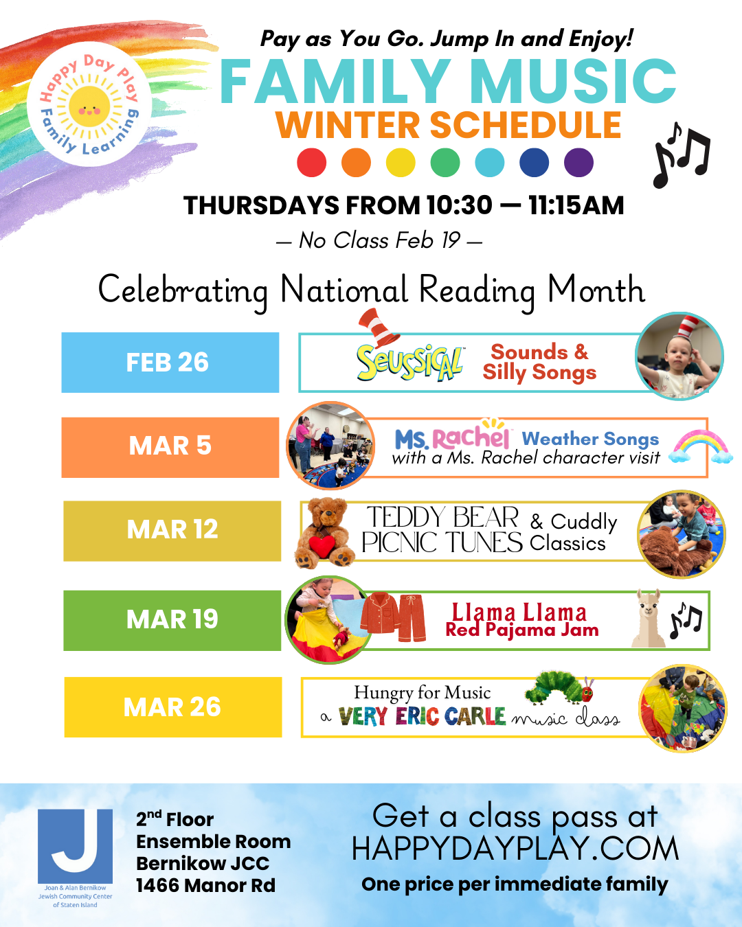 Thursdays from 10:30am to 11:15am in the 2nd Floor Ensemble Room at Bernikow JCC 1466 Manor Rd Staten Island, NY 10314